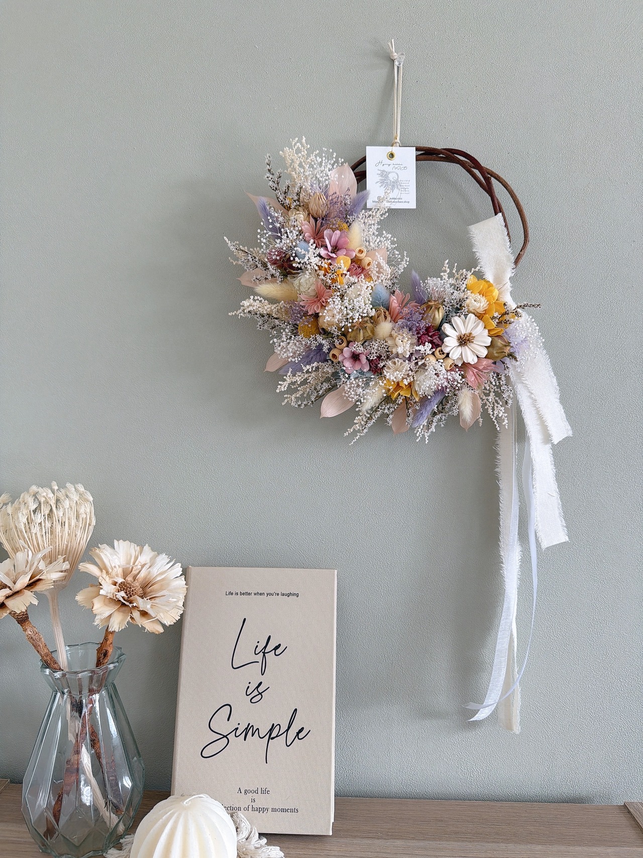 リース土台は、ツルを曲げて形から自作したオリジナル。