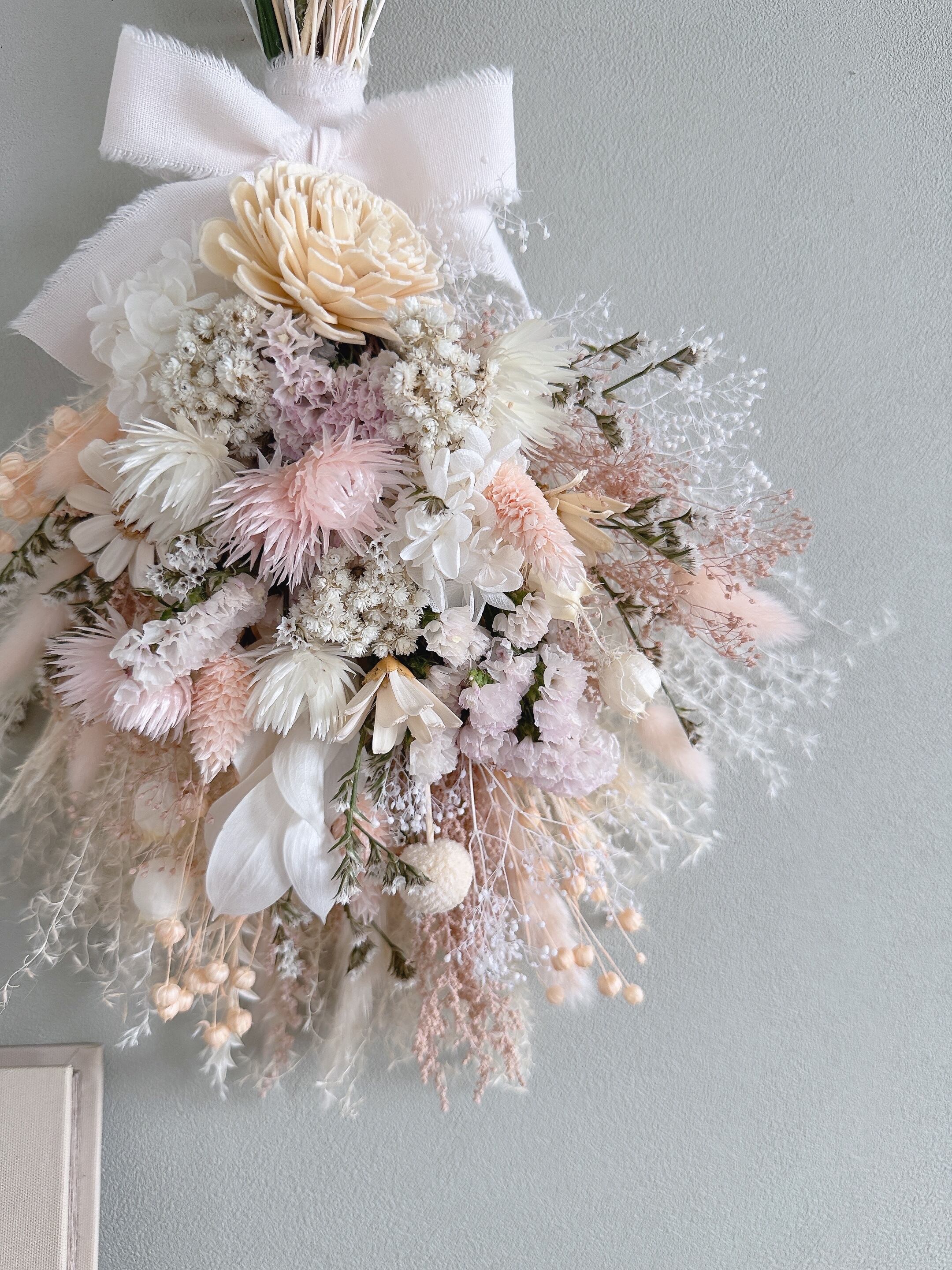 やわらかなニュアンスピンクに、ナチュラルな草花の動きを添えたスワッグ