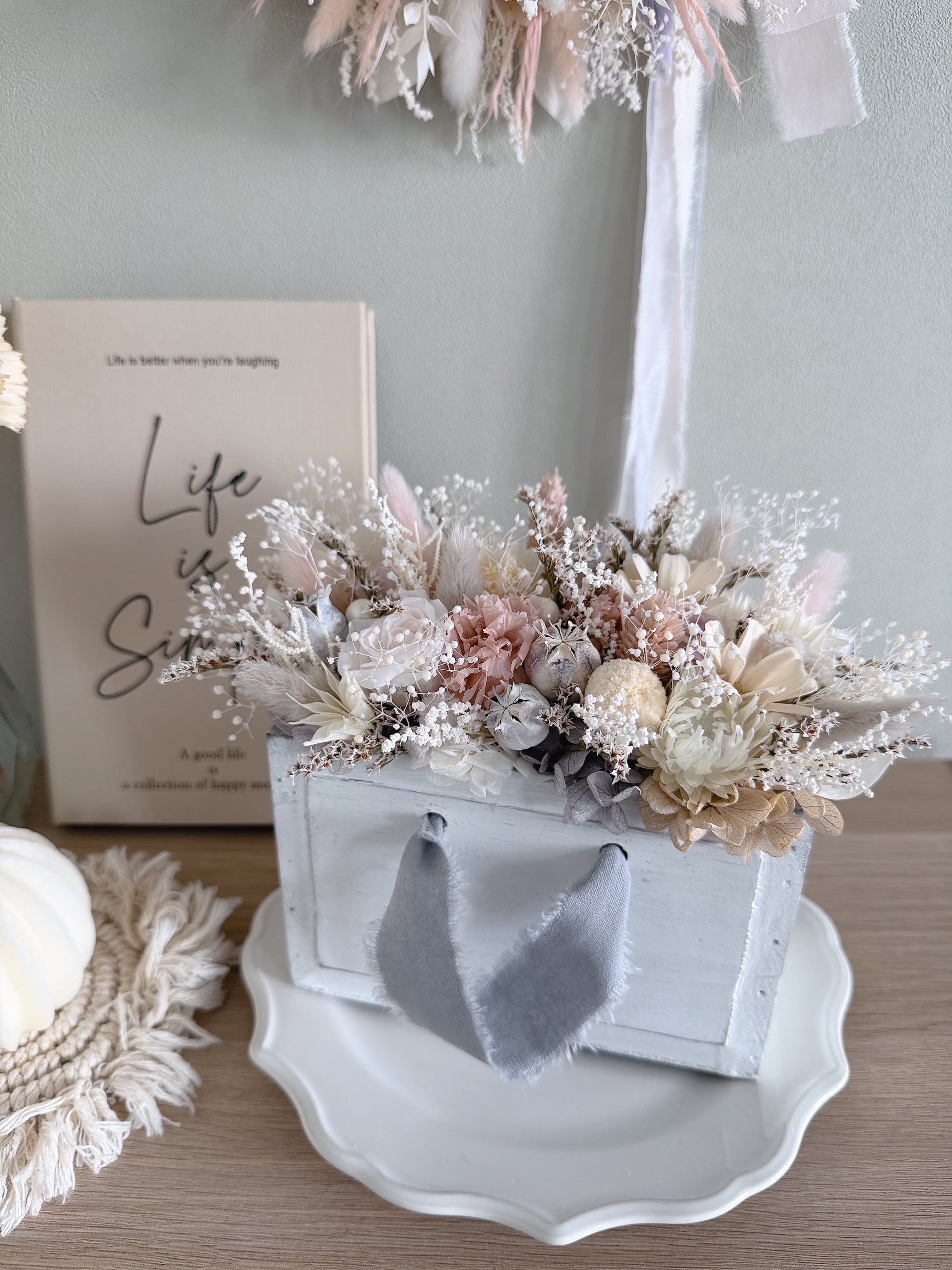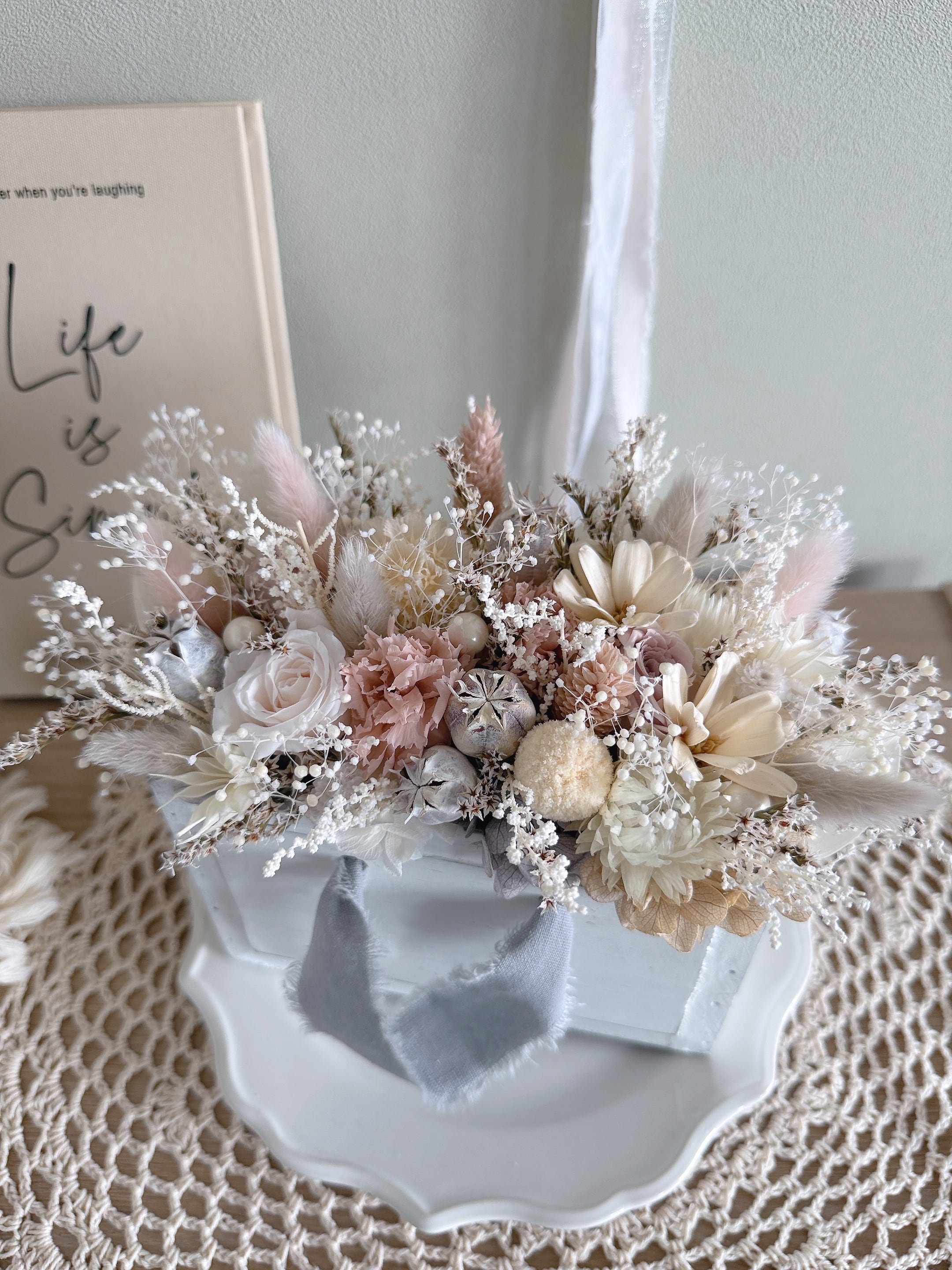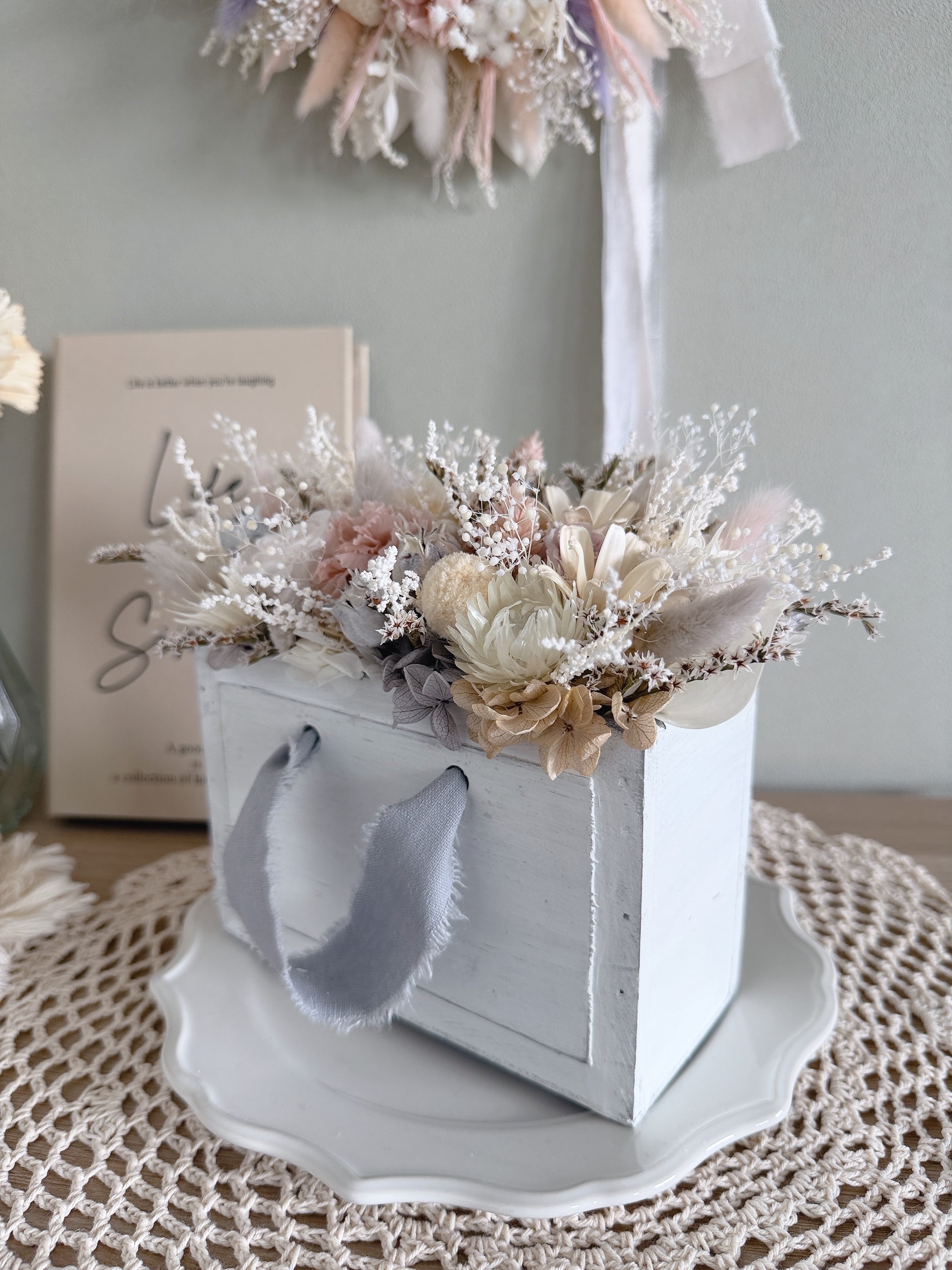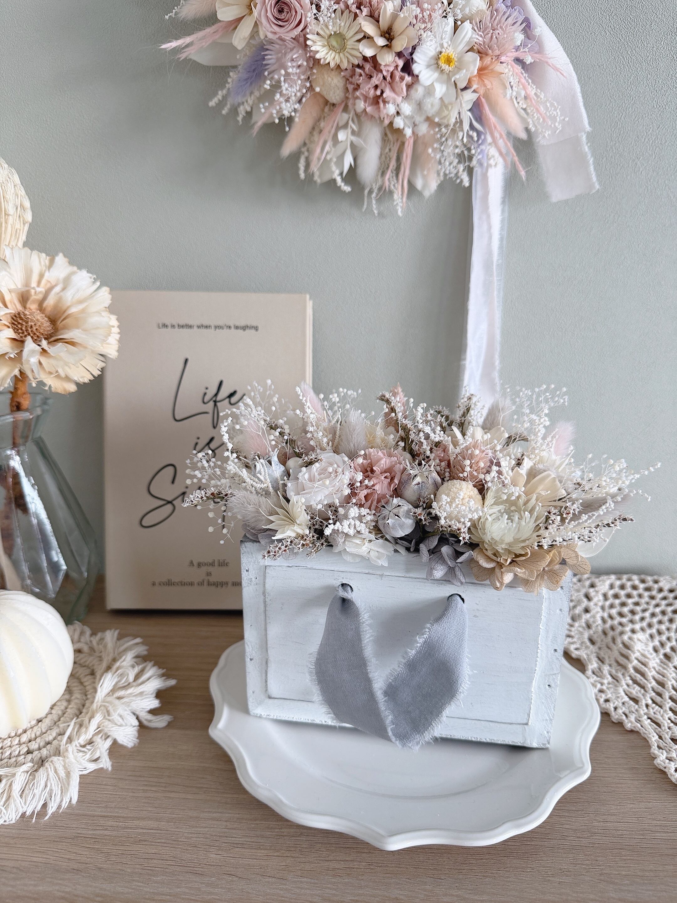 繊細なドライフラワーをたっぷりと使用。