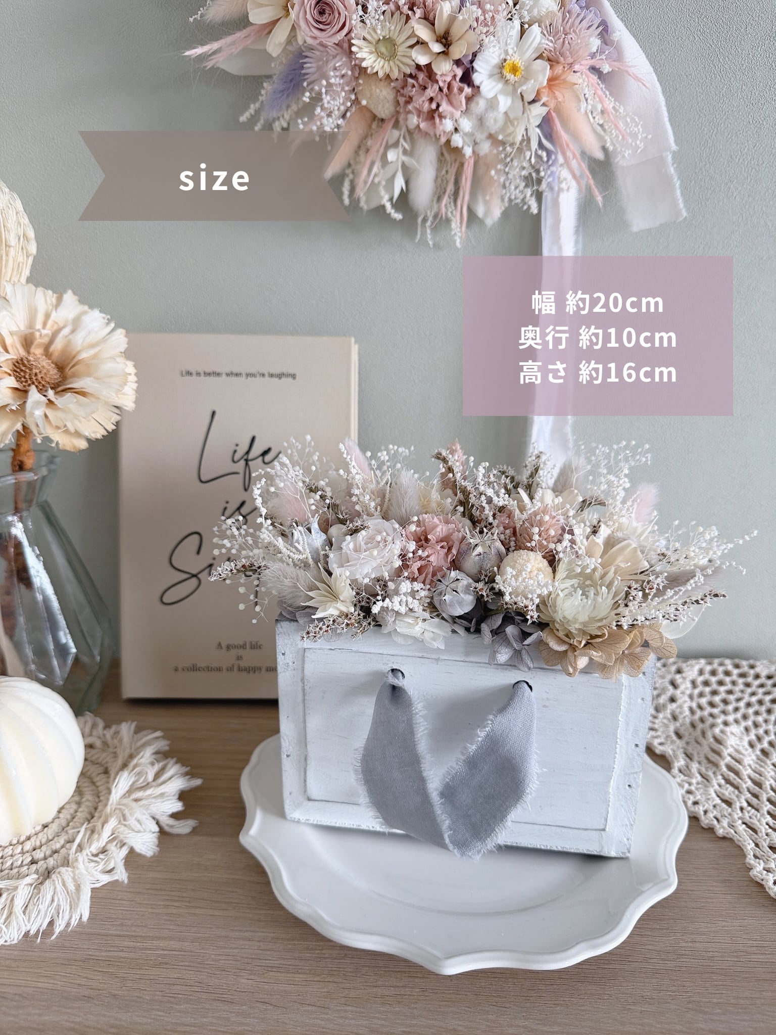 花材は、色変わりしにくいドライフラワーと