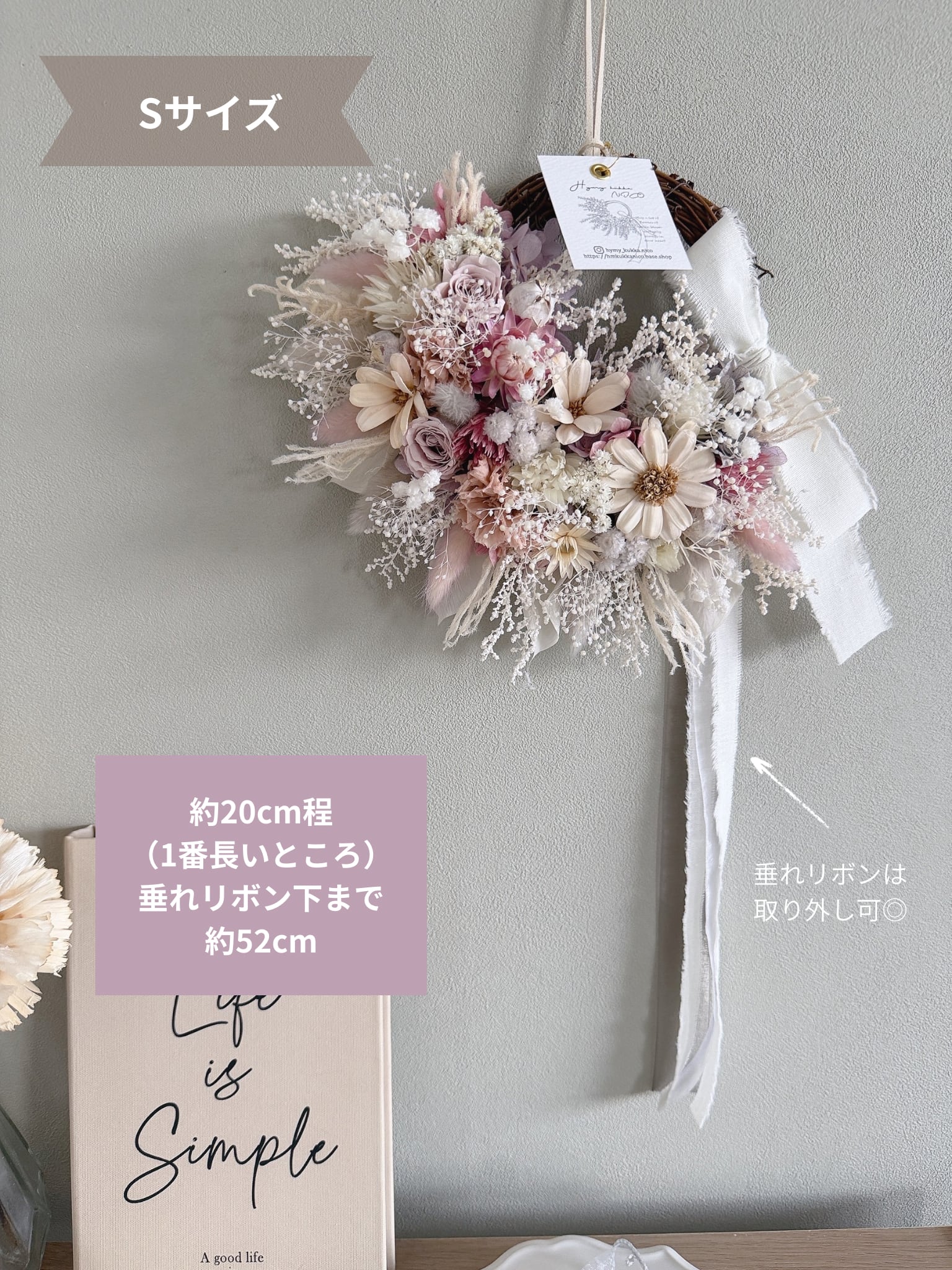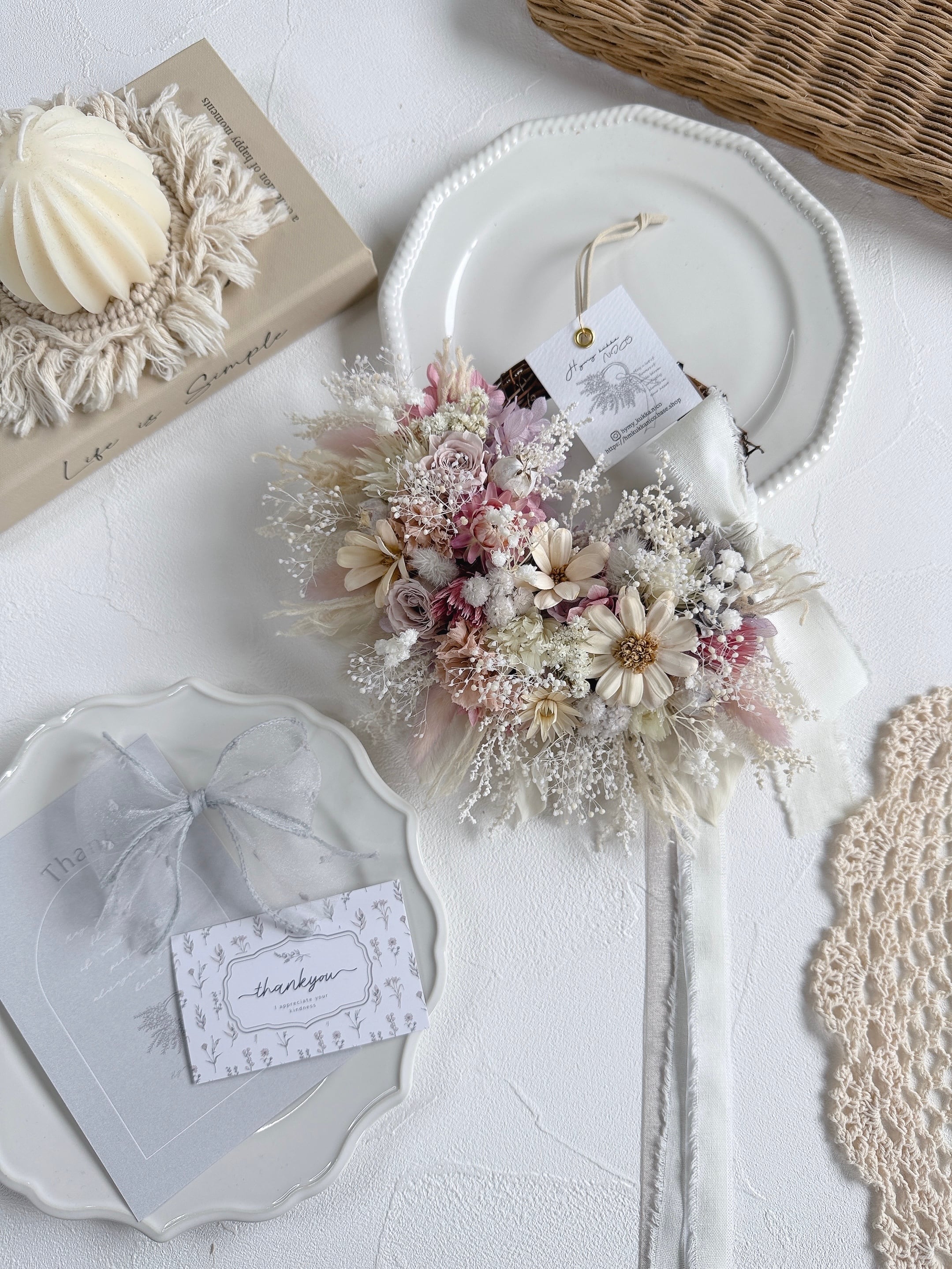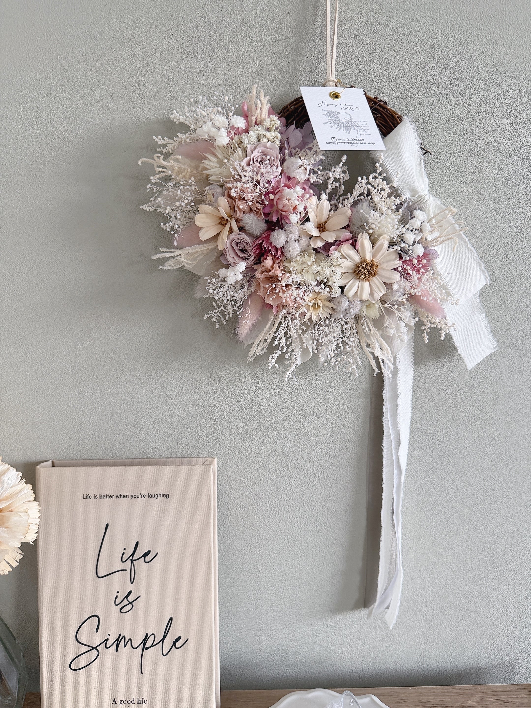 花材は、色変わりしにくいドライフラワーとプリザーブドフラワーを厳選。