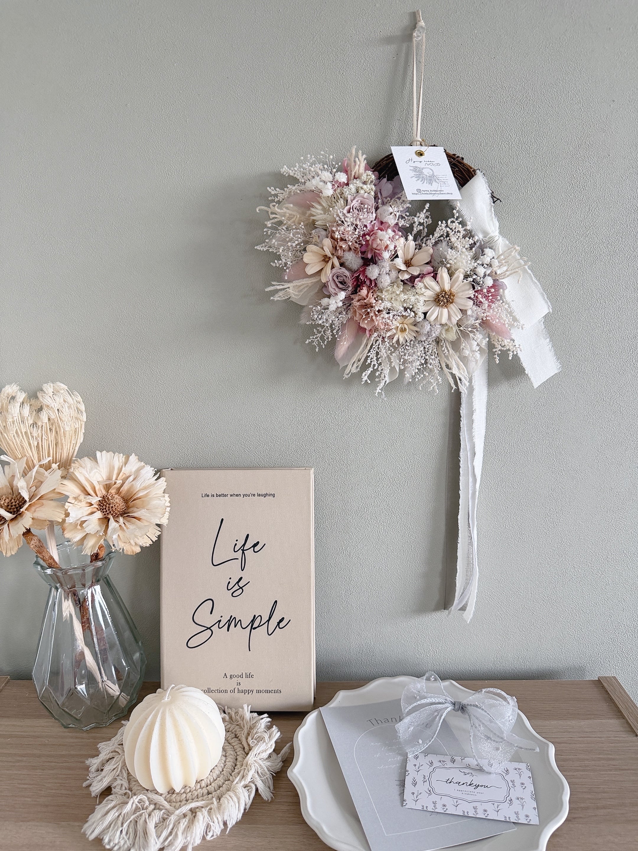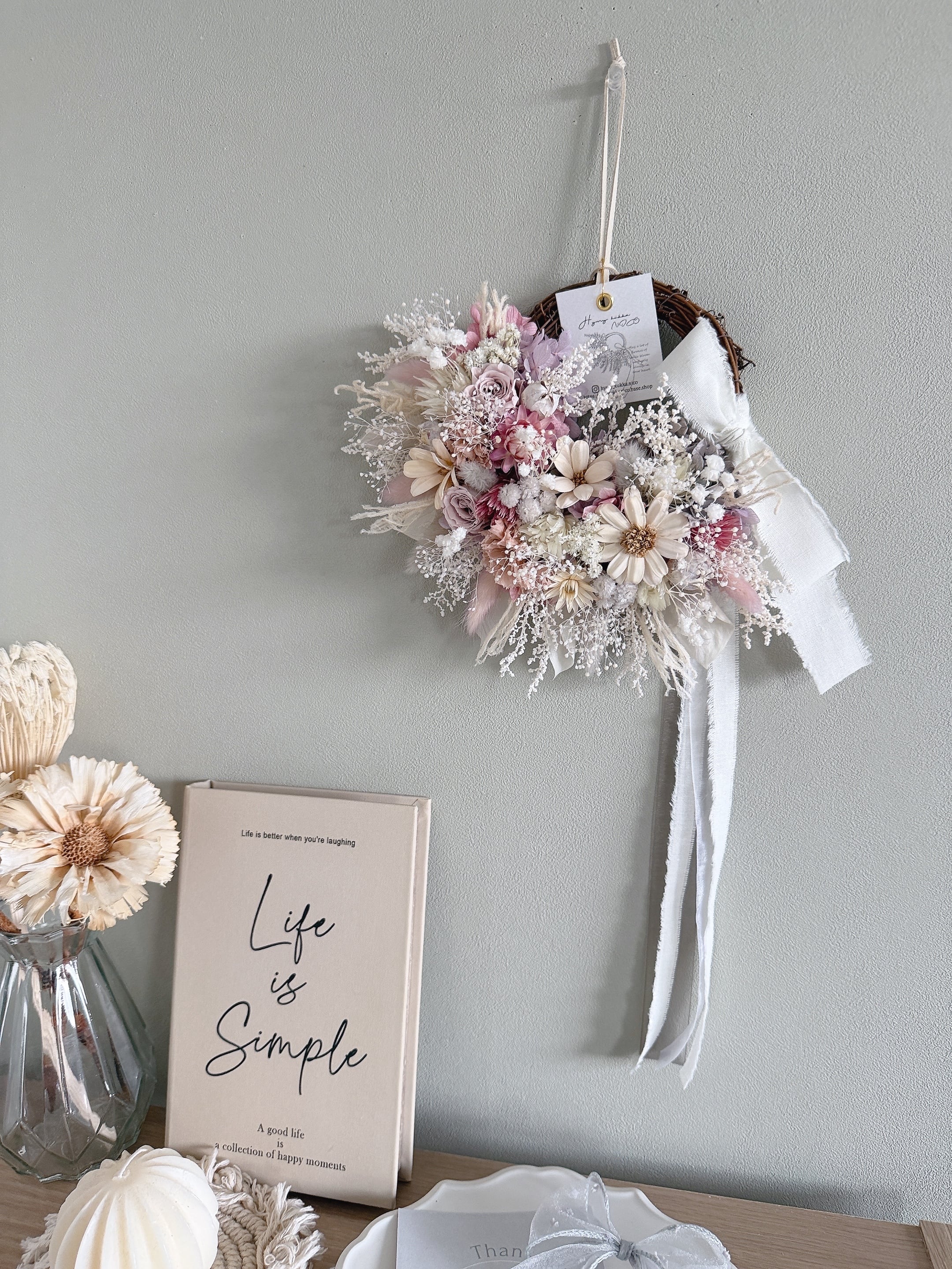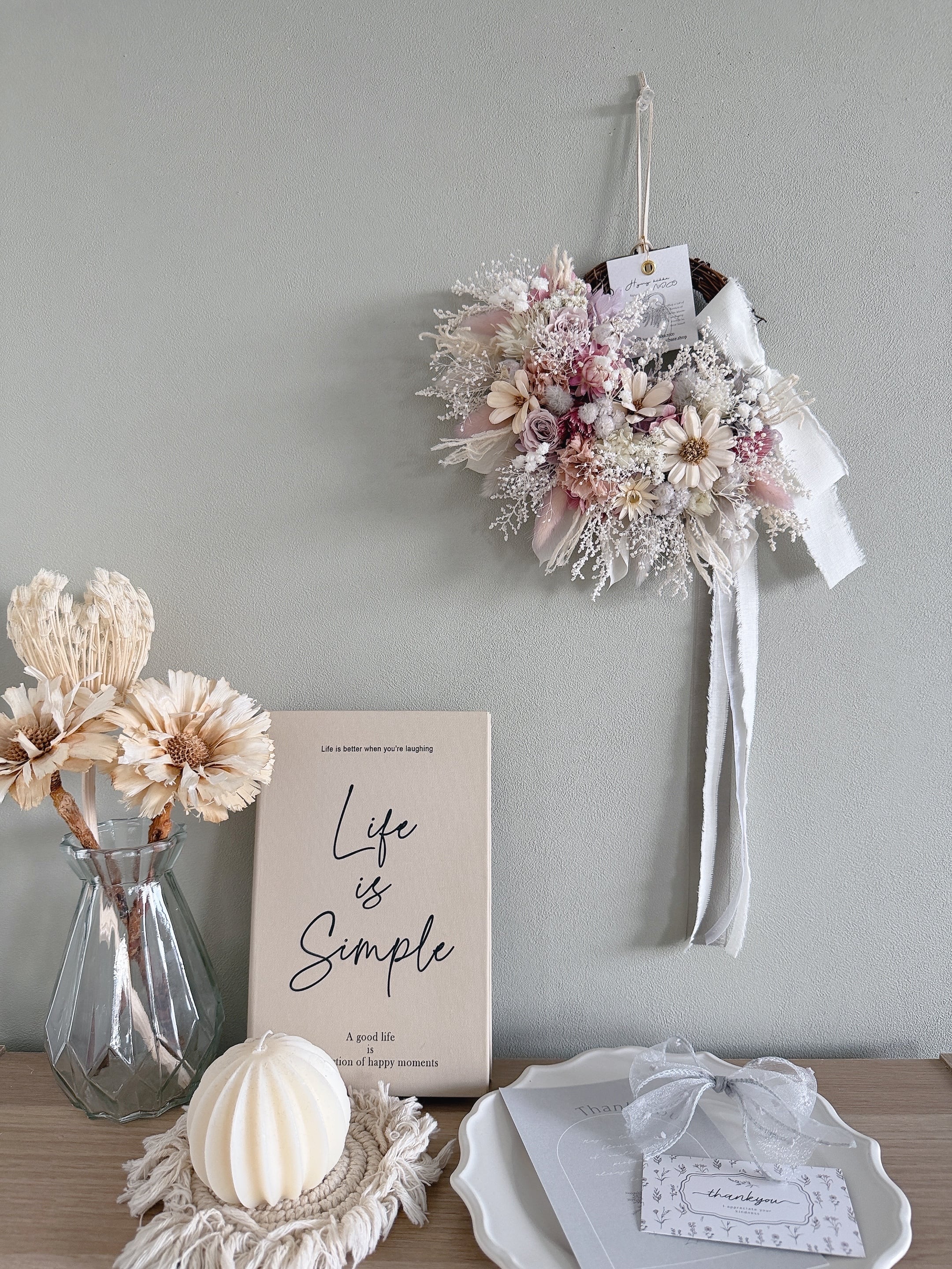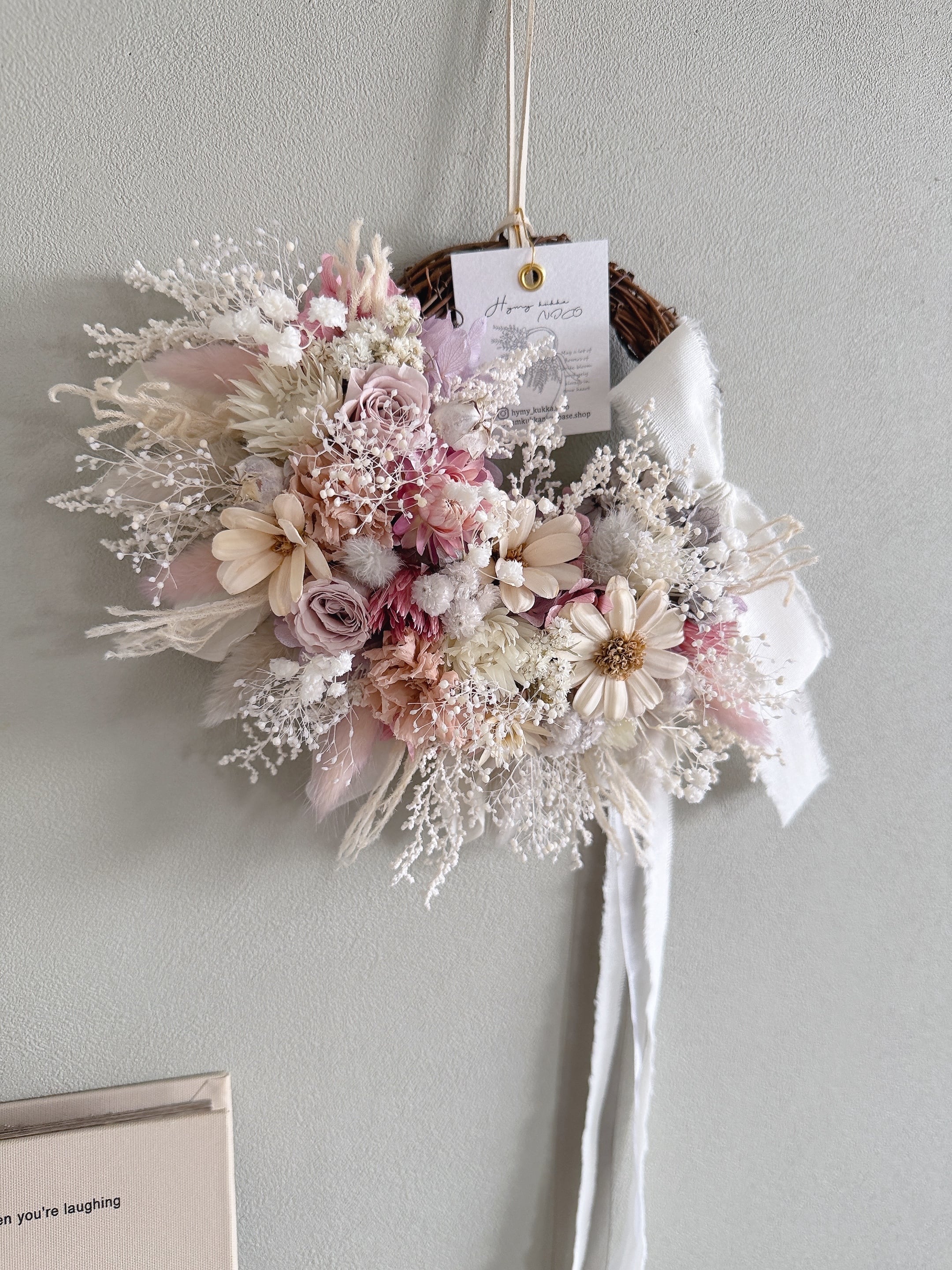 花材は、色変わりしにくいドライフラワーとプリザーブドフラワーを厳選。